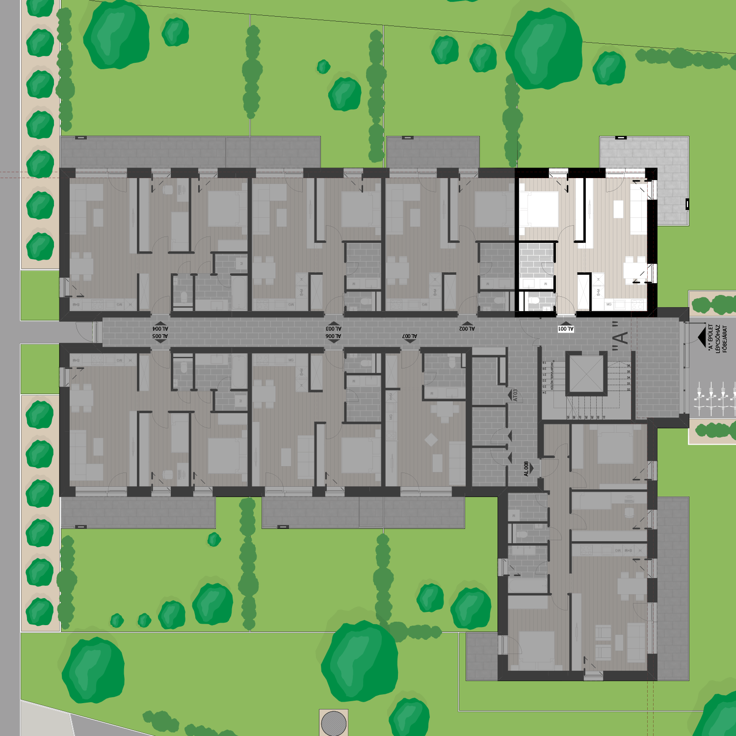 Az AL001 lakás a földszinten található, 42,49 m2 területű, 11,65 m2 terasszal és 137,58 m2 kerttel rendelkezik. Az ára 62.958.800 Ft.