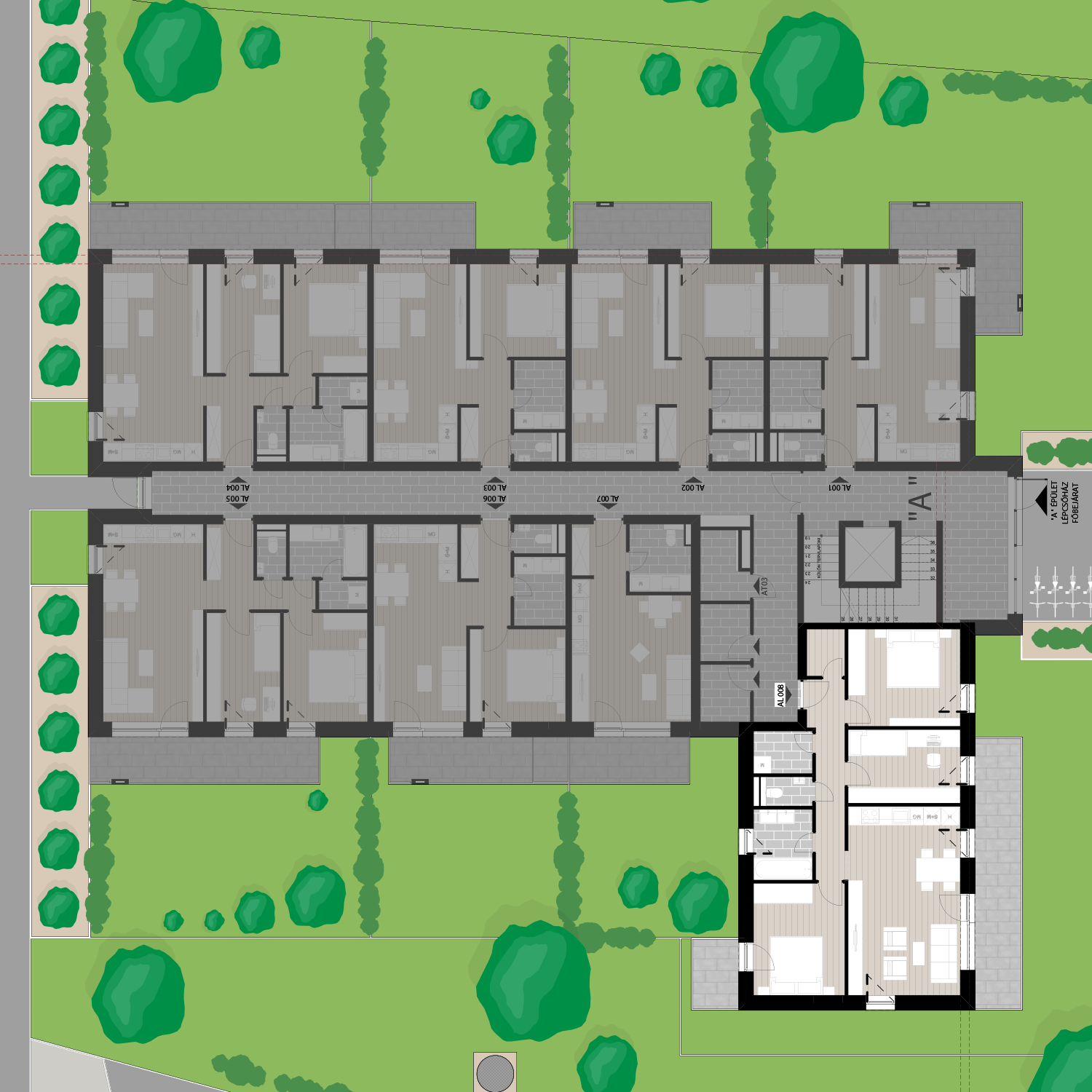 Az AL008 lakás a földszinten található, 78,84 m2 területű, ezen felül egy 3,84 m2 és egy 15,10 m2 különálló terasszal és 120,35 m2 kerttel rendelkezik. Az ára 105.346.940 Ft.
