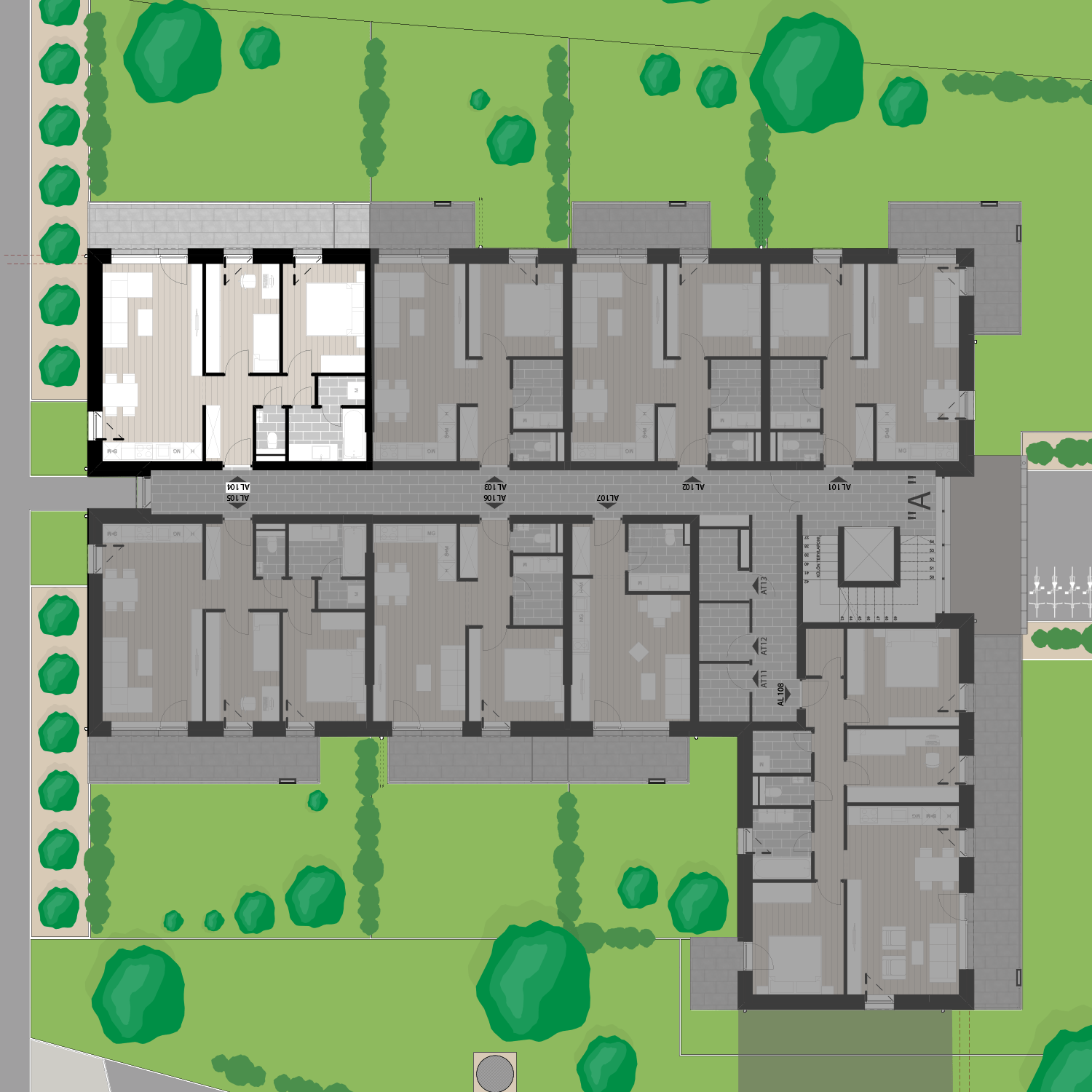 Az AL104 lakás az 1. emeleten található, 58,20 m2 területű és 13,35 m2 erkéllyel emellett 1,77 m2 tárolóval rendelkezik. Az ára 77.490.600 Ft.