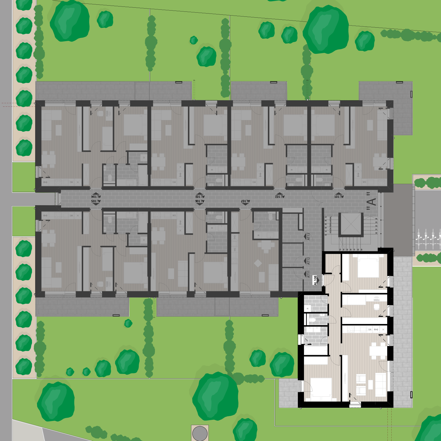 Az AL108 lakás az 1. emeleten található, 78,84 m2 területű és 19,99 m2 és 3,63 m2 különálló erkéllyel rendelkezik. Az ára 99.750.840 Ft.