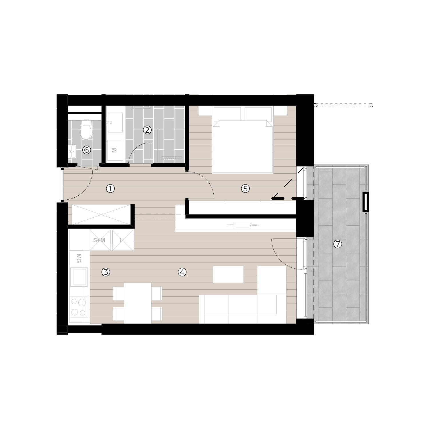 Az BL102 lakás a 1. emeleten található, 42,21 m2 területű és 7,4 m2 erkéllyel rendelkezik. Az ára 46.228.000 Ft.