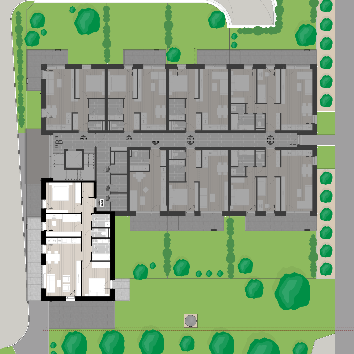 Az BL208 lakás a 2. emeleten található, 78,98 m2 területű, 14,47 m2 és 3,63 m2 erkéllyel rendelkezik. Az ára 91.118.390 Ft.
