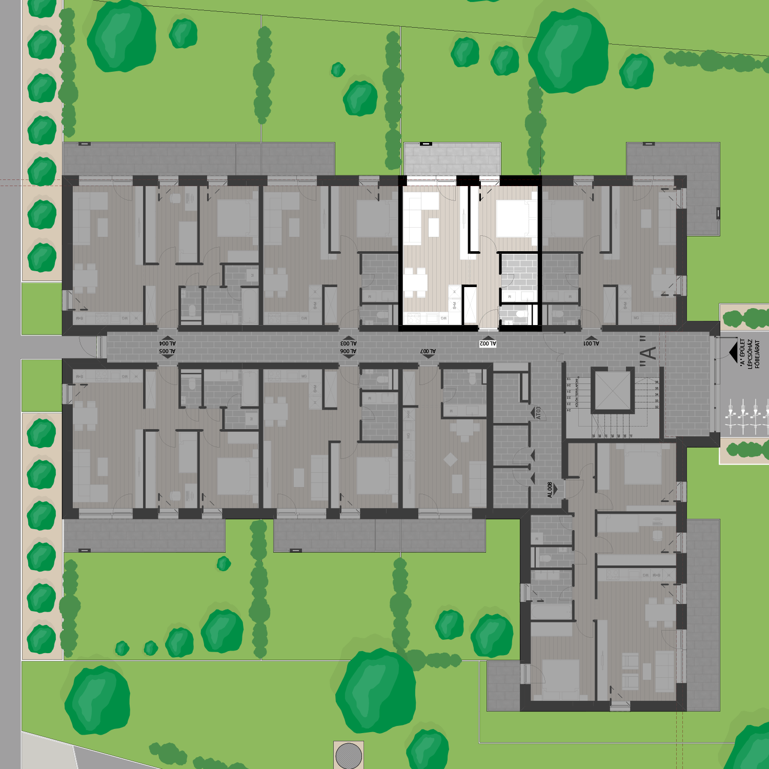 Az AL003 lakás a földszinten található, 42,47 m2 területű, 5,87 m2 terasszal és 43,83 m2 kerttel rendelkezik. Az ára 57.807.100 Ft.
