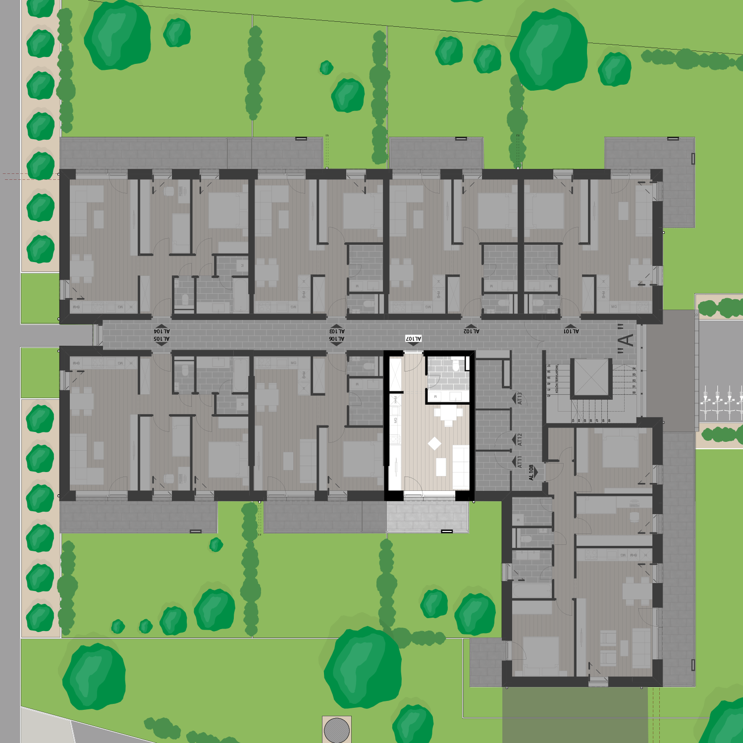 Az AL107 lakás az 1. emeleten található, 26,61 m2 területű és 6,5 m2 erkéllyel rendelkezik. Az ára 38.830.000 Ft.