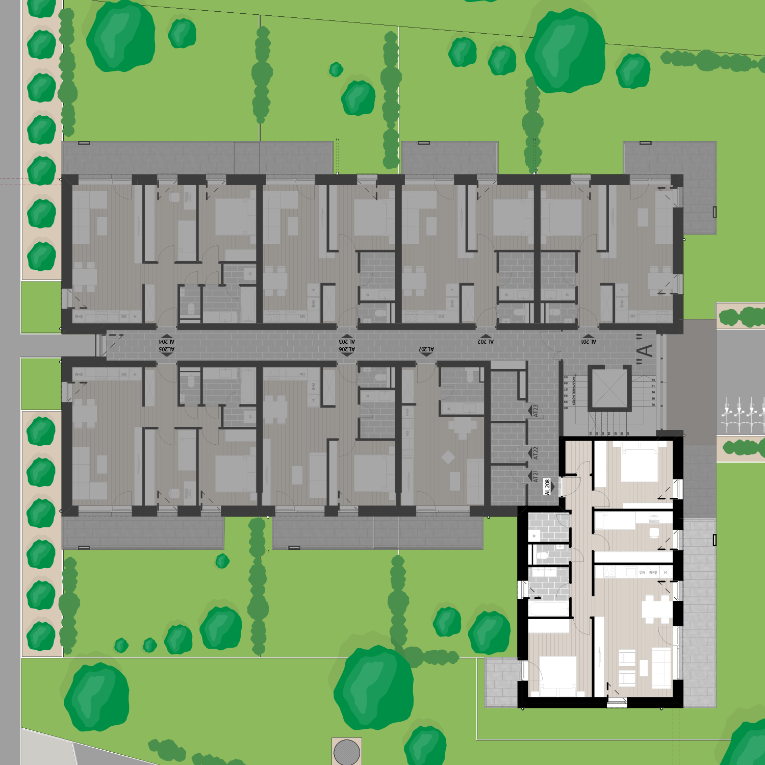 Az AL208 lakás a 2. emeleten található, 78,84 m2 területű és 14,47 m2 és 3,63 m2 különálló erkéllyel rendelkezik. Az ára 99.254.040 Ft.