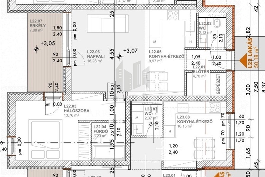 Az L22 -es lakás, első emeleti, 50,07 m2 alapterületű, amihez 7,2 m2-es erkély tartozik. Illetve lehetőség van a későbbiekben zöldtető-terasz kialakításra.