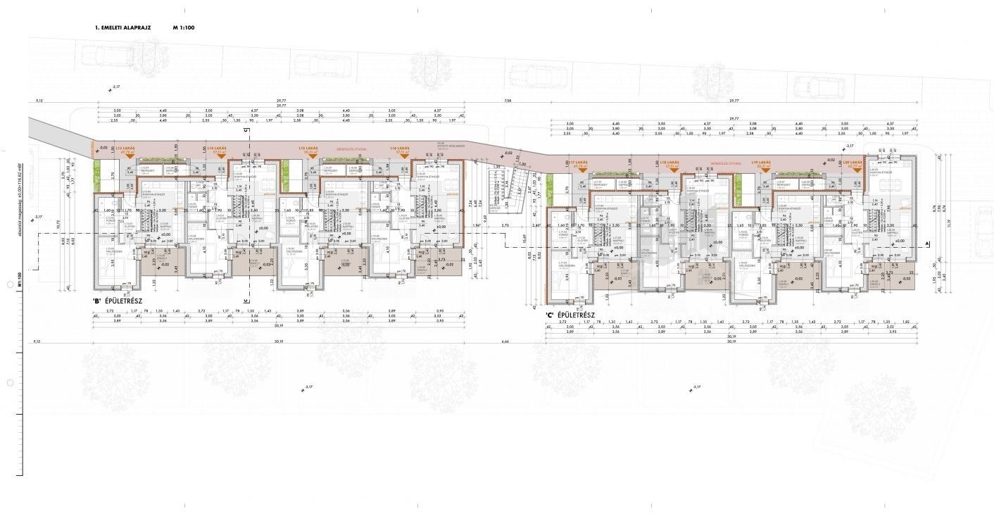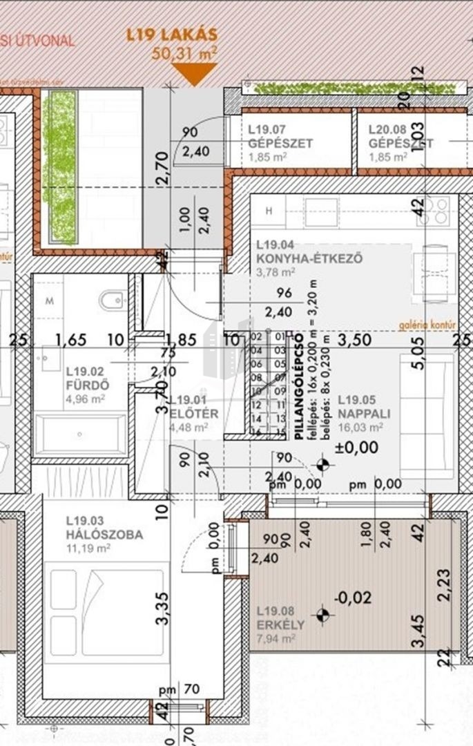 Az L19 -es lakás, első emeleti, 50,31 m2 alapterületű, amihez 5,49 m2-es erkély tartozik. Illetve lehetőség van a későbbiekben zöldtető-terasz kialakításra.