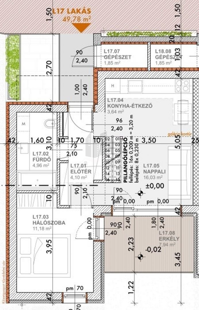 Az L17-es lakás, első emeleti, 49,78 m2 alapterületű, amihez 7,94 m2-es erkély tartozik. Illetve lehetőség van a későbbiekben zöldtető-terasz kialakításra.