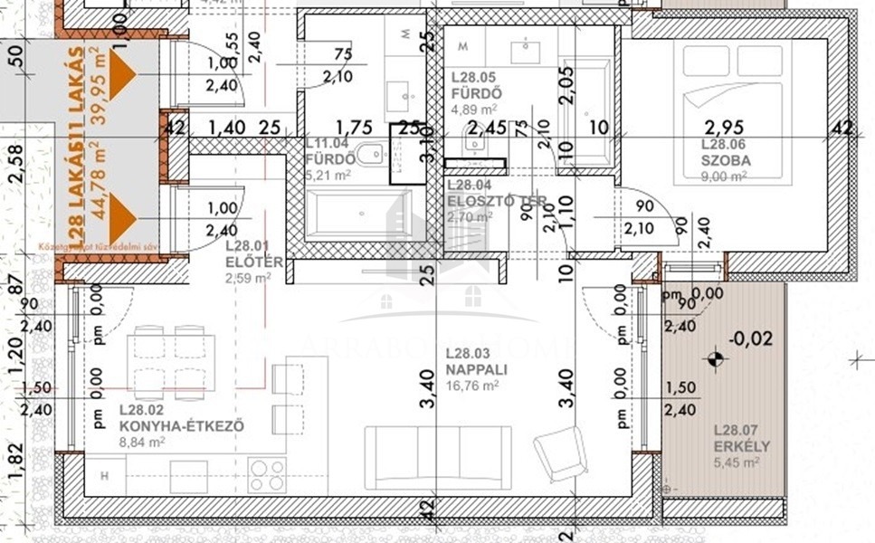 Az L28-as lakás, földszinti, 44,78 m2 alapterületű, amihez 5,45 m2-es terasz tartozik.