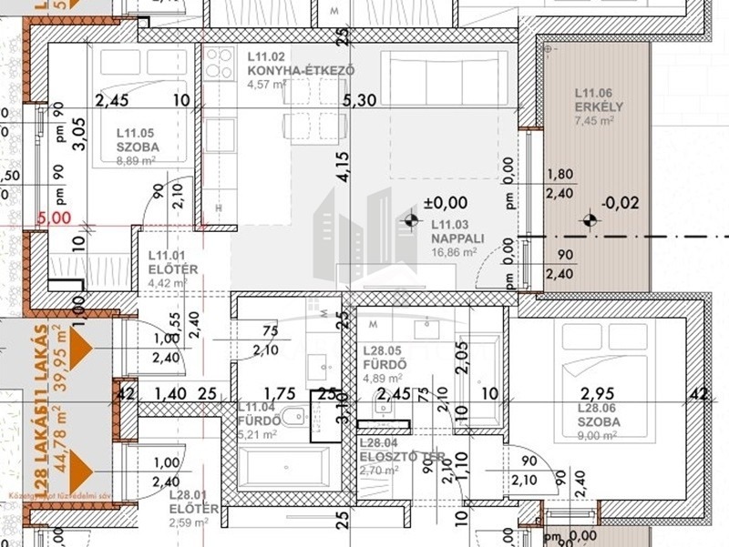 Az L11-es lakás, földszinti, 39,95 m2 alapterületű, amihez 7,45 m2-es terasz tartozik.