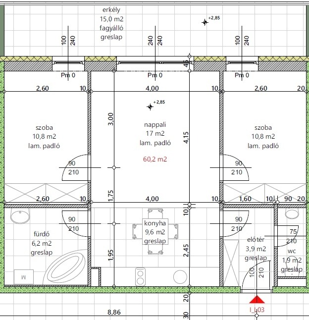 Elosztását tekintve: előtér, konyha-étkező, nappali, 2 hálószoba, fürdőszoba, WC.