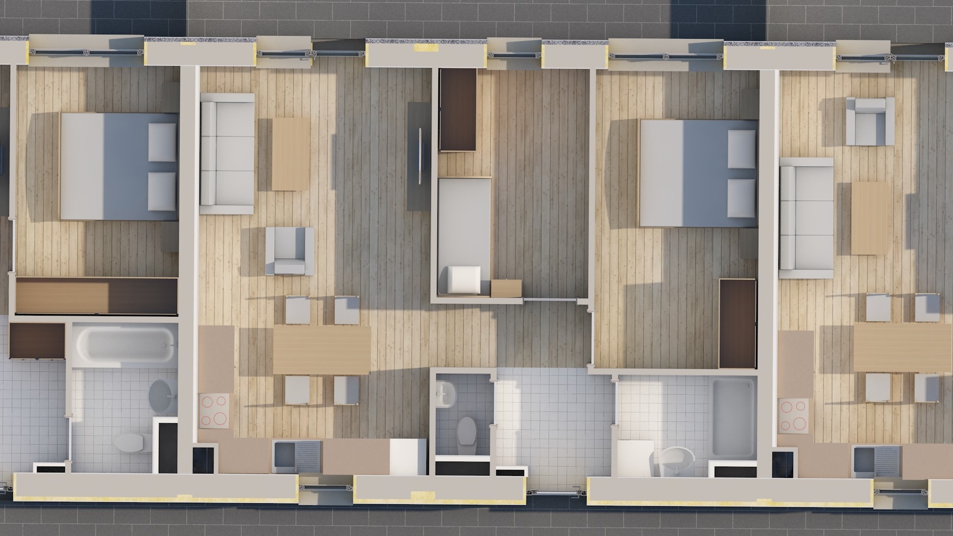 A földszinten 16 db garázs, 36 db fedett parkoló és 28 db kültéri parkoló található, ezekből opcionálisan választható, de legalább 1 db gépkocsi beálló vásárlása kötelező. Ezen kívül minden szinten privát tároló vételére is van lehetőség.