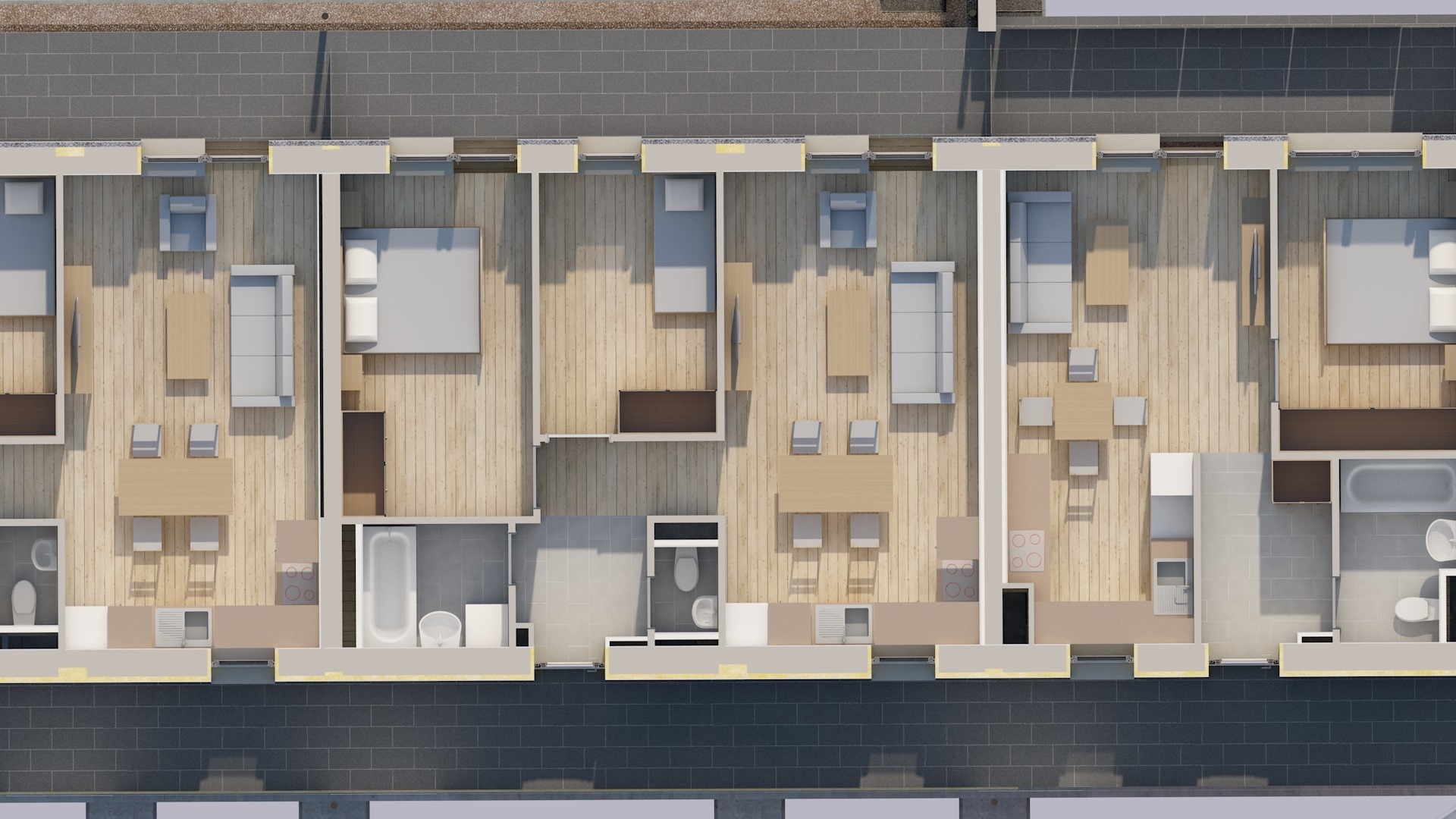 A földszinten 16 db garázs, 36 db fedett parkoló és 28 db kültéri parkoló található, ezekből opcionálisan választható, de legalább 1 db gépkocsi beálló vásárlása kötelező. Ezen kívül minden szinten privát tároló vételére is van lehetőség.