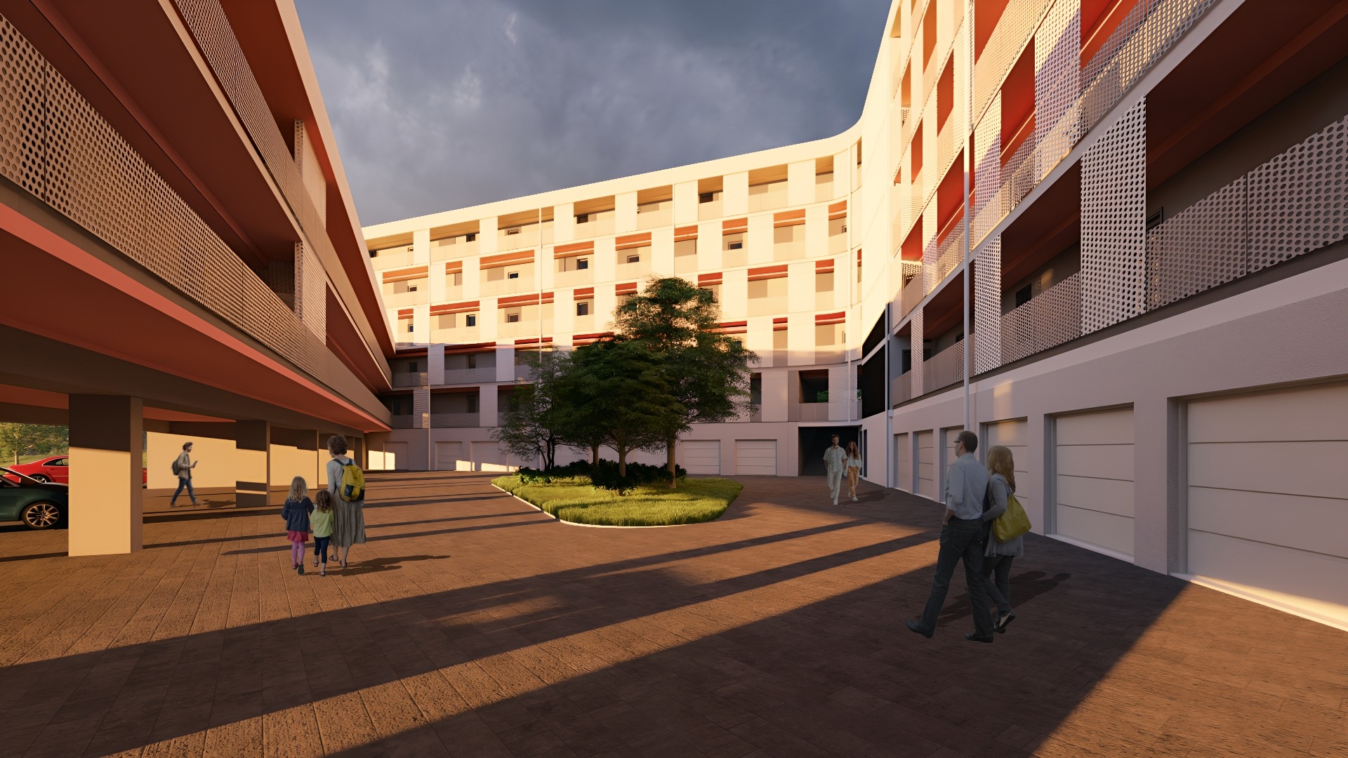 A földszinten 16 db garázs, 36 db fedett parkoló és 28 db kültéri parkoló található, ezekből opcionálisan választható, de legalább 1 db gépkocsi beálló vásárlása kötelező. Ezen kívül minden szinten privát tároló vételére is van lehetőség.