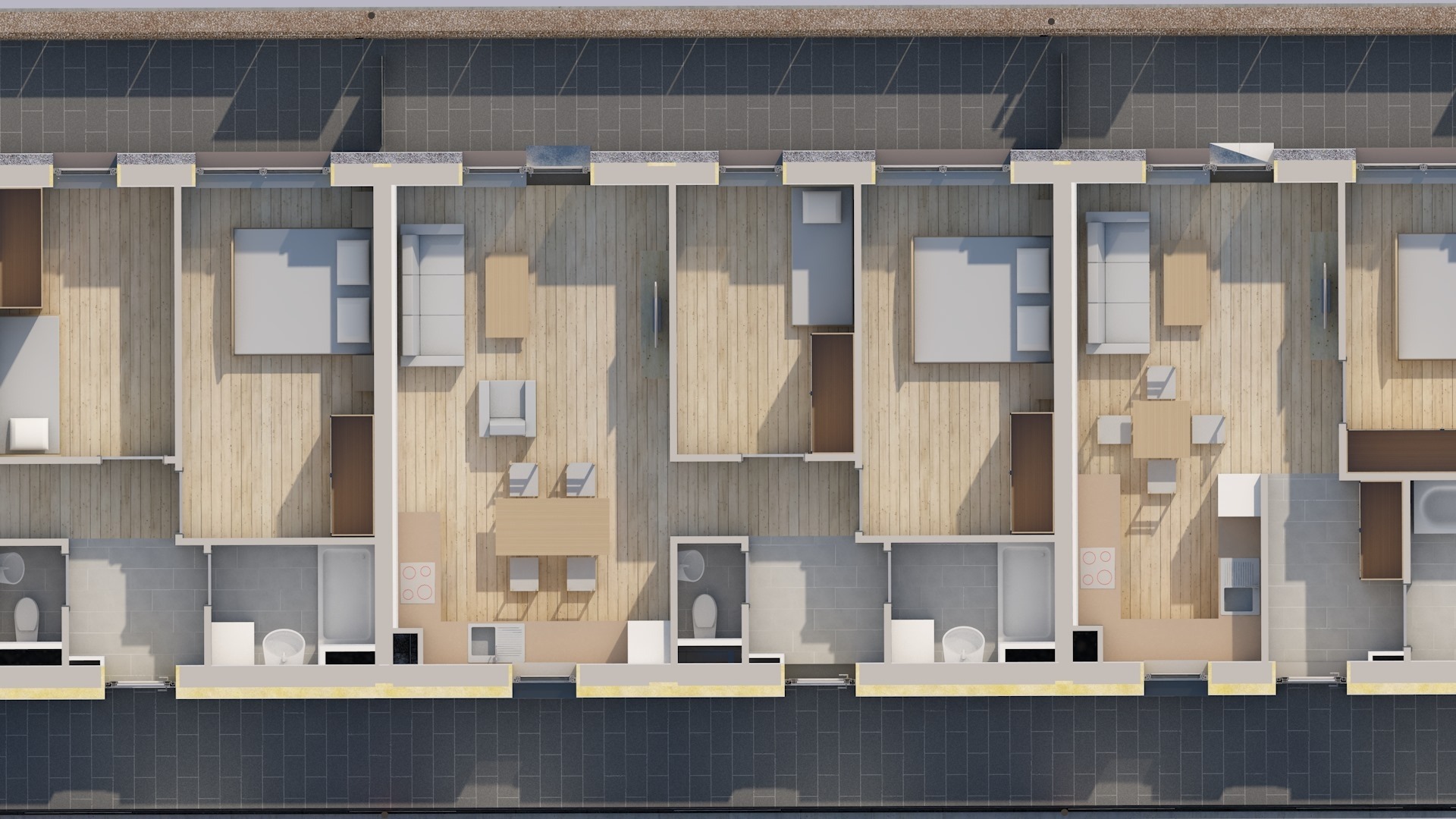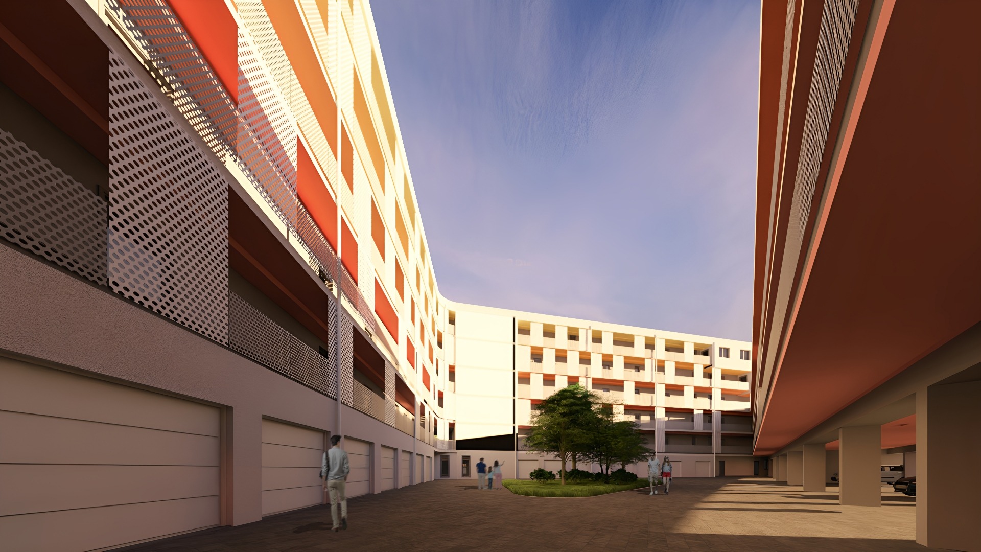 A földszinten 16 db garázs, 36 db fedett parkoló és 28 db kültéri parkoló található, ezekből opcionálisan választható, de legalább 1 db gépkocsi beálló vásárlása kötelező. Ezen kívül minden szinten privát tároló vételére is van lehetőség.