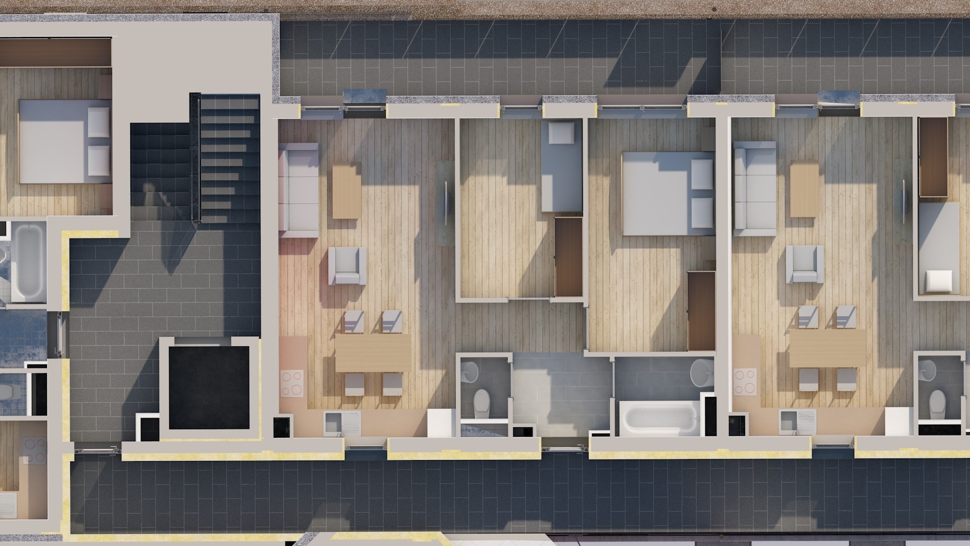 A földszinten 16 db garázs, 36 db fedett parkoló és 28 db kültéri parkoló található, ezekből opcionálisan választható, de legalább 1 db gépkocsi beálló vásárlása kötelező. Ezen kívül minden szinten privát tároló vételére is van lehetőség.