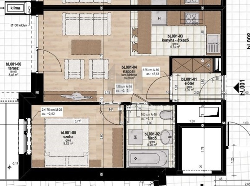 A BL001-es lakás, földszinti, 42,4 m2 alapterületű, amihez 8,76 m2-es terasz tartozik.