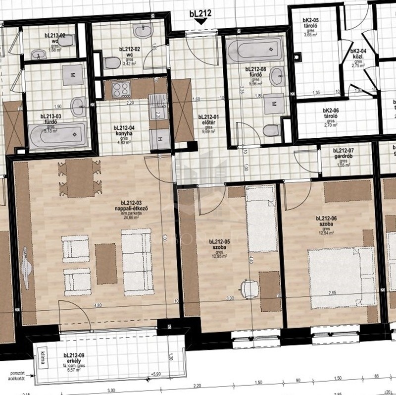 A BL212-es lakás, 2. emeleti, 75,6 m2 alapterületű, amihez 6,57 m2-es erkély tartozik.