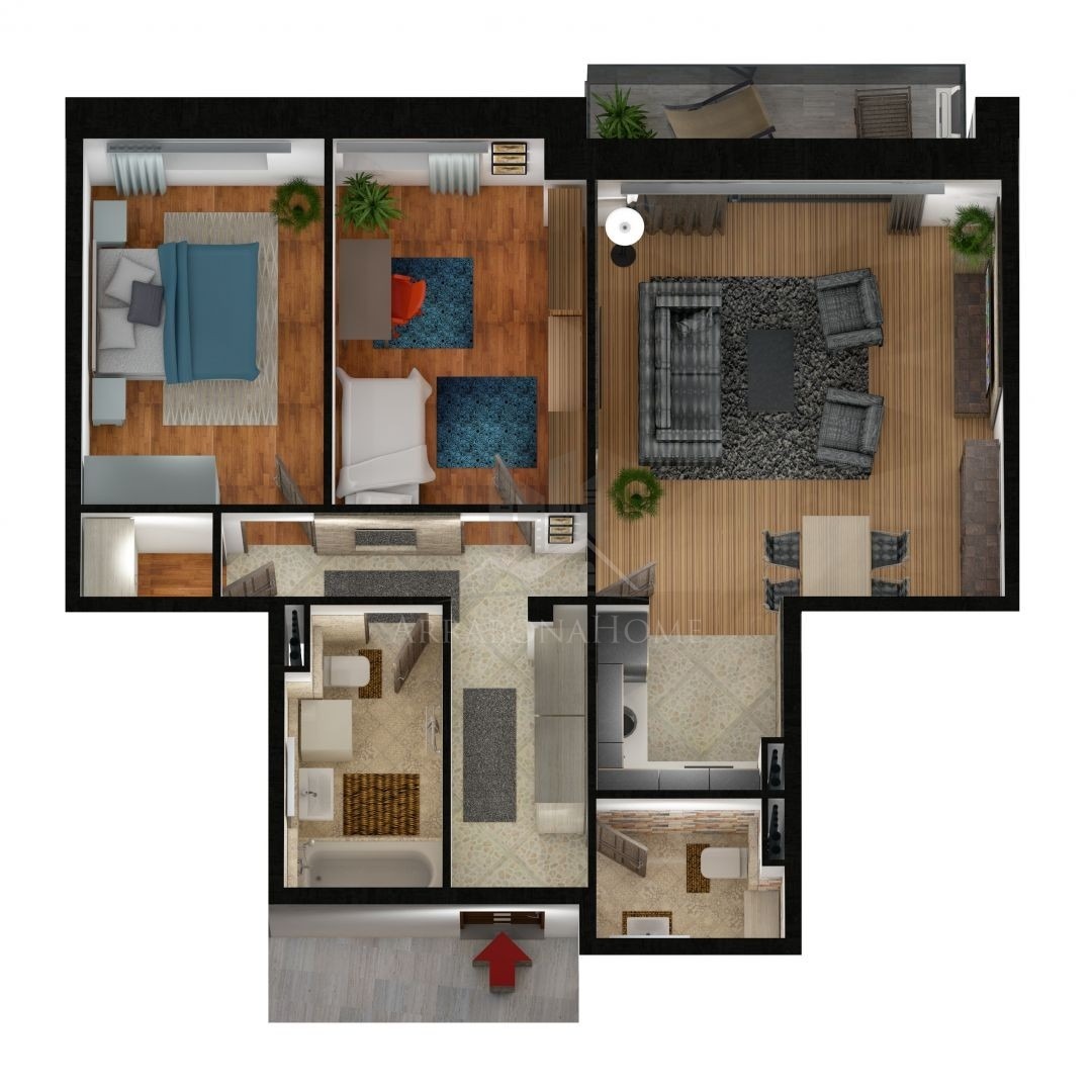Elosztását tekintve: előtér, nappali-konyha-étkező, 2 szoba, fürdőszoba, WC.