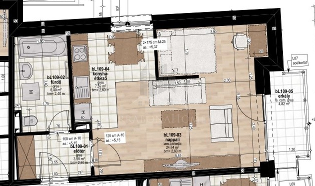 A BL109-es lakás, első emeleti, 42,91 m2 alapterületű, amihez 4,82 m2-es erkély tartozik.
