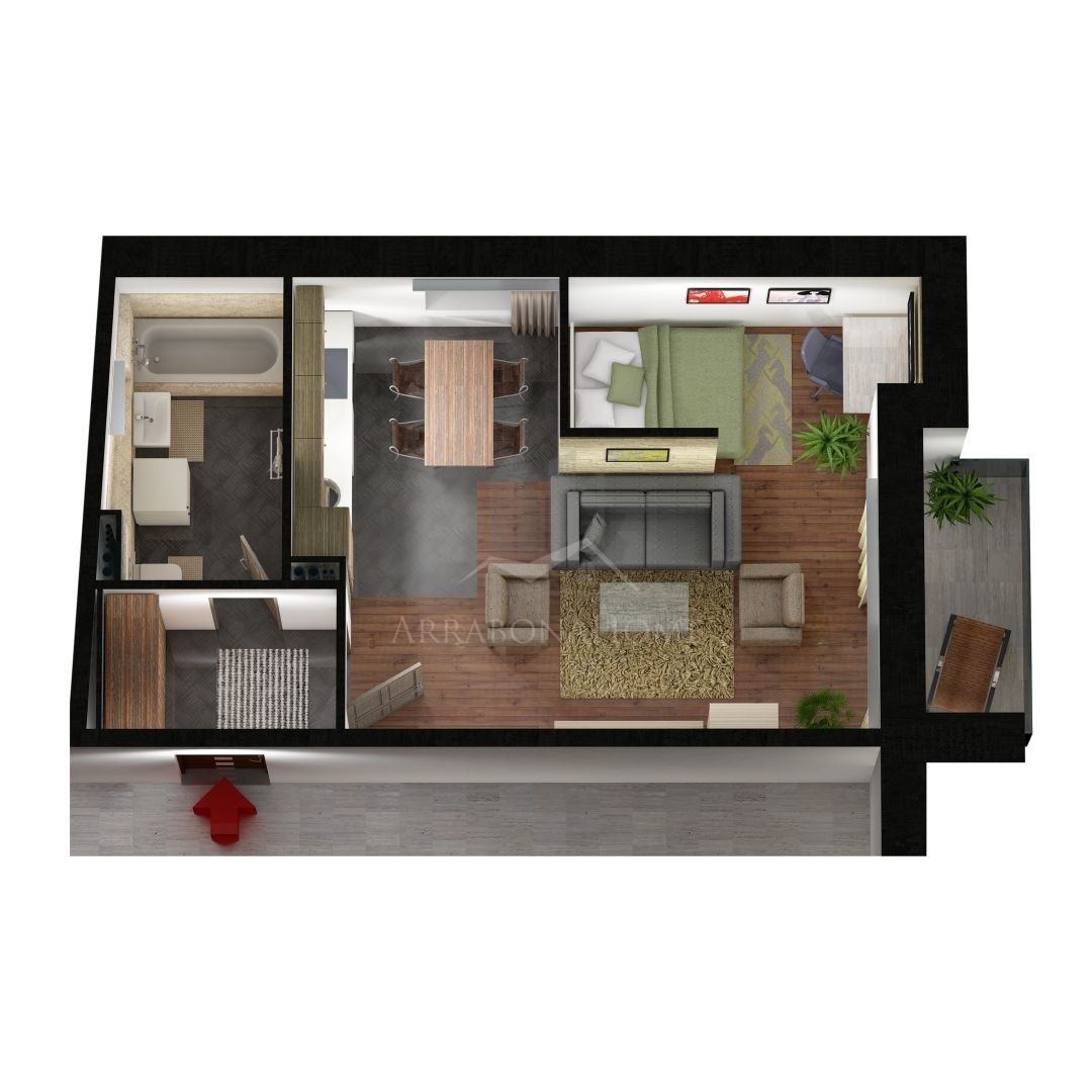 Elosztását tekintve: előtér, nappali-konyha-étkező, 1 szoba, fürdőszoba.