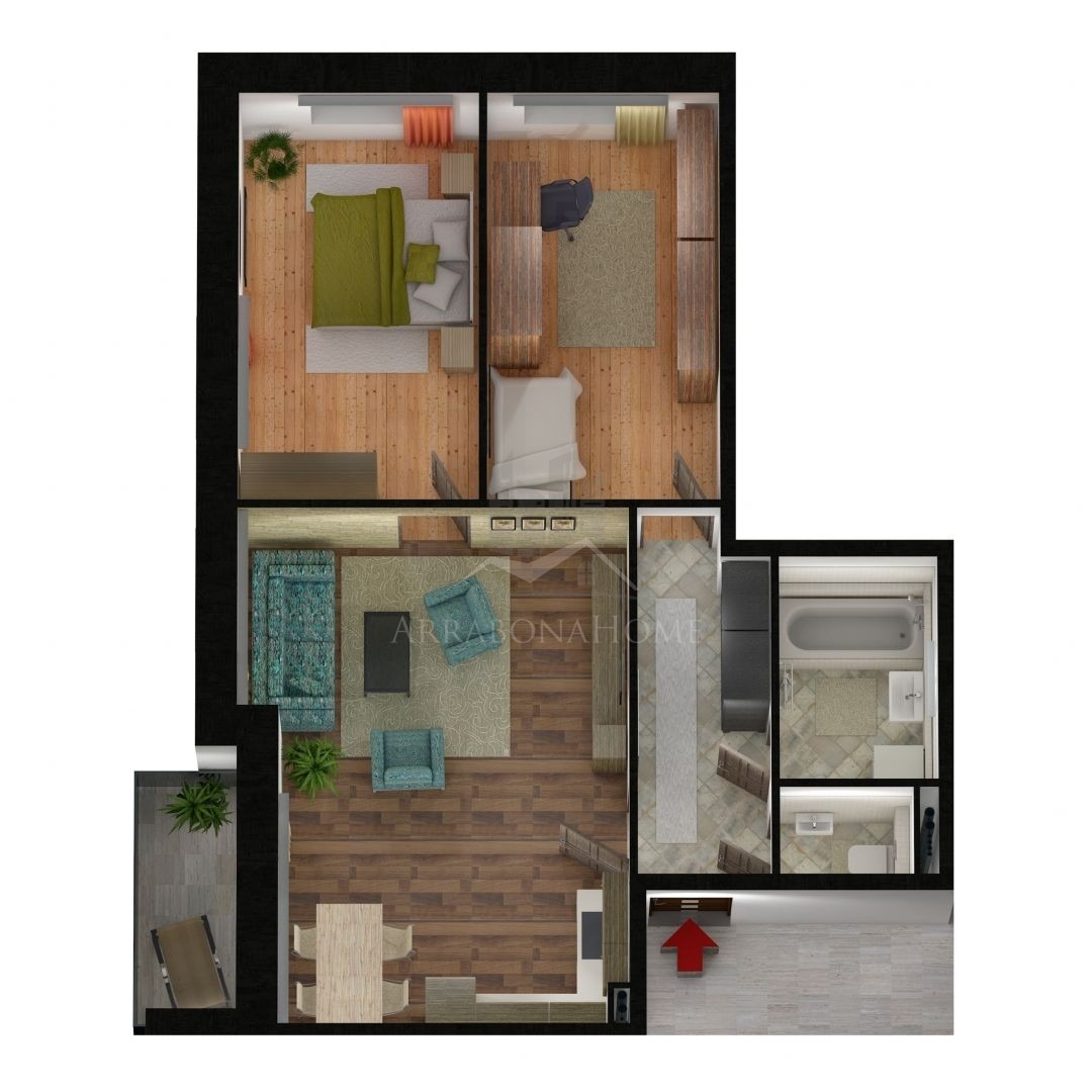 Elosztását tekintve: előtér, nappali-konyha-étkező, 2 szoba, fürdőszoba,WC.