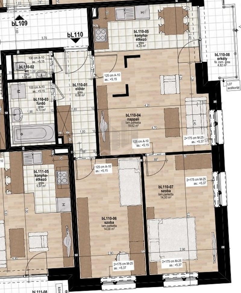 A BL110-es lakás, első emeleti, 69,84 m2 alapterületű, amihez 4,82 m2-es erkély tartozik.