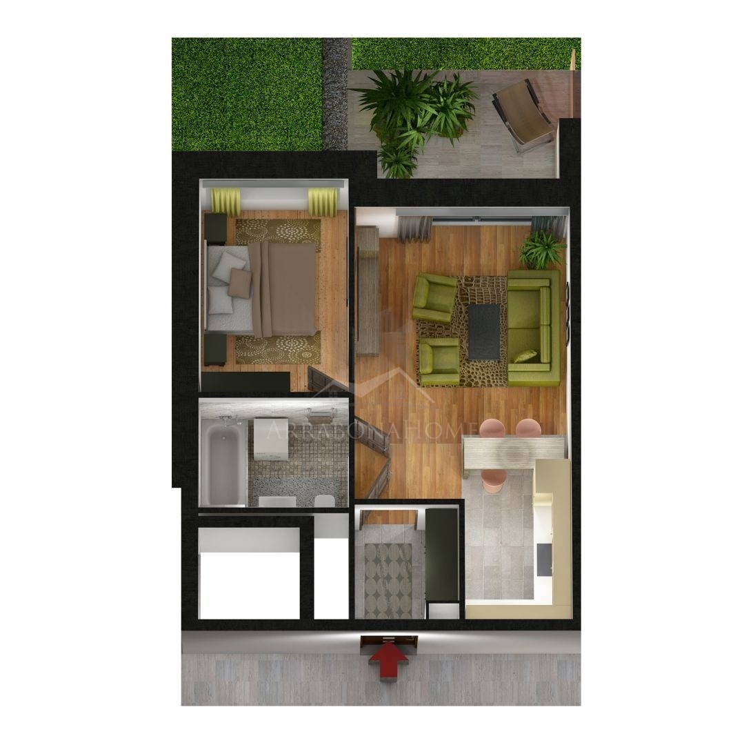 Elosztását tekintve: előtér, nappali-konyha-étkező, 1 szoba, fürdőszoba.