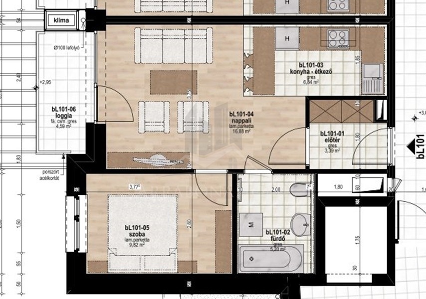 A BL101-es lakás, első emeleti, 42,4 m2 alapterületű, amihez 4,82 m2-es erkély tartozik.